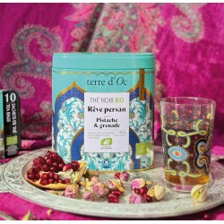 Inspired by Persian rituals, this intense black tea reveals velvety fragrances of pistachio and sparkling pomegranate, enhanced by rose petals. In the Chai Khâne, these tea houses where one lingers and where the samovar murmurs slowly, the tea is served in fine chiseled glasses placed on silver saucers, accompanied by pieces of sugar that are let melt on the tongue. From the bazaar to the gardens, tea celebrates the art of welcoming, contemplating and honoring the moment. In Persia, we like to say: " tea soothes your heart and opens the doors of beauty.