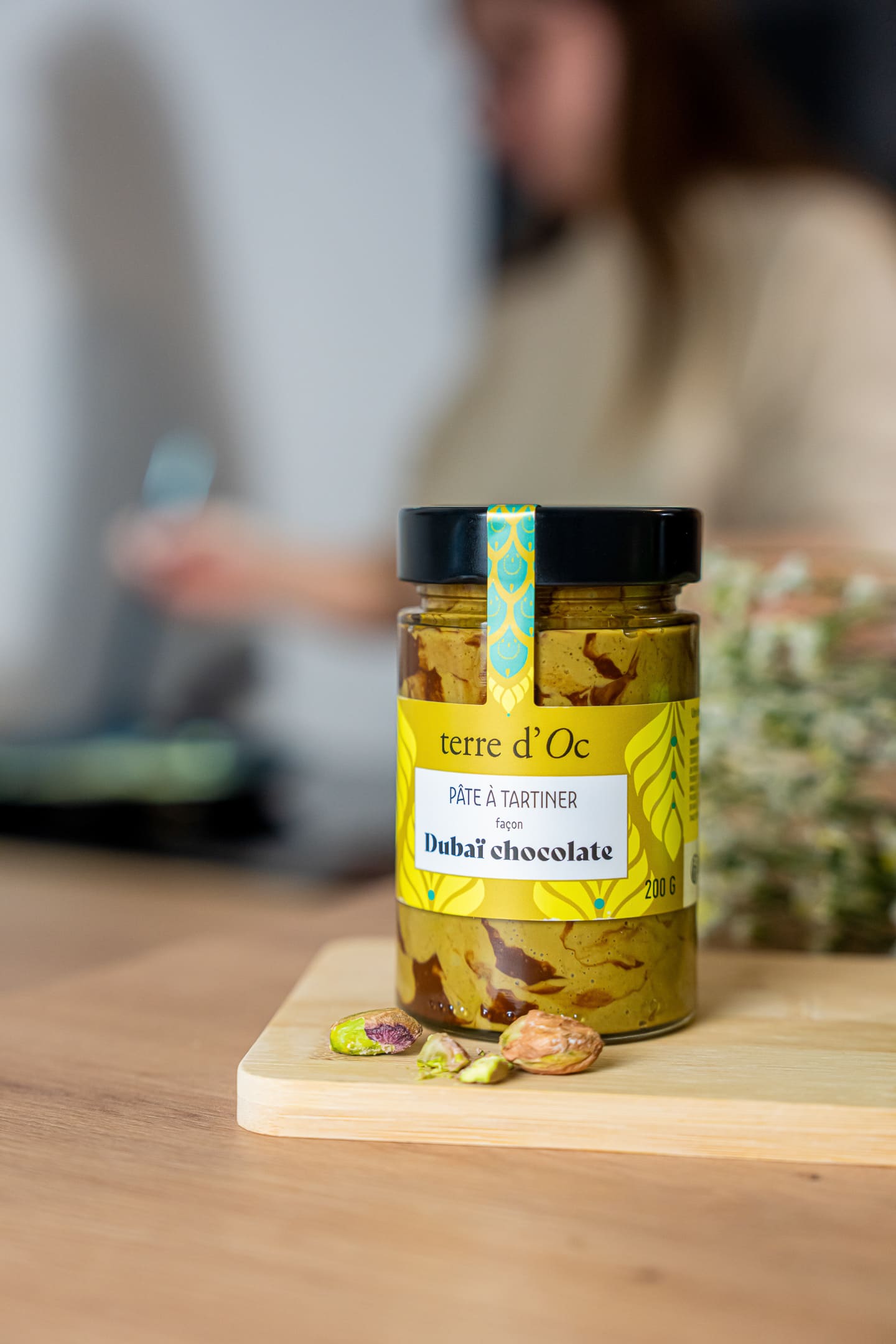 A tribute to the sweets of Dubai: generous pistachio, melting white chocolate and crunchy kadaïf unite in a gourmet and addictive creation.
