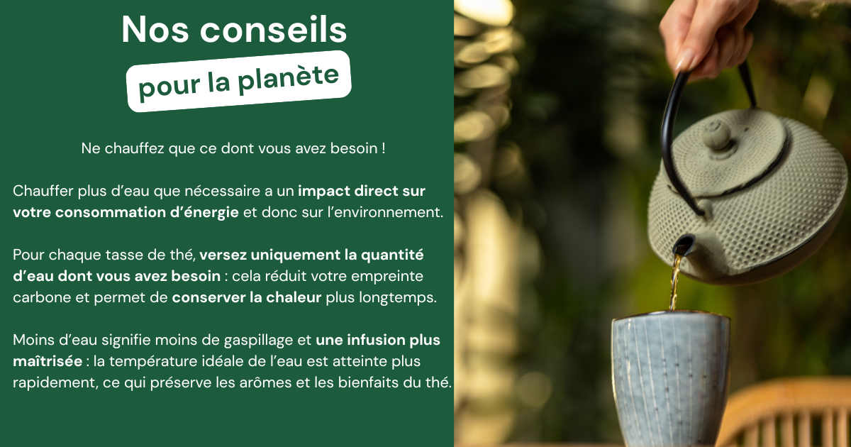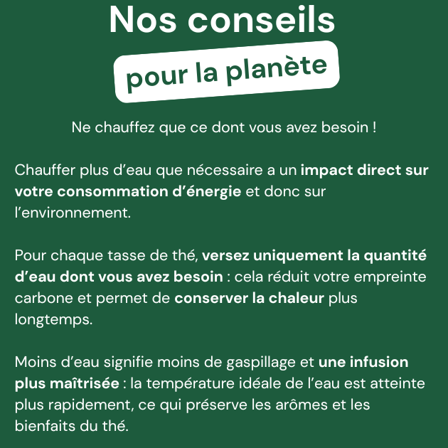 - Couvrez votre tasse (ou votre théière) pendant l’infusion : pour libérer pleinement les arômes et éviter qu'ils ne s'évaporent. Ainsi, chaque gorgée reste chaude et savoureuse.