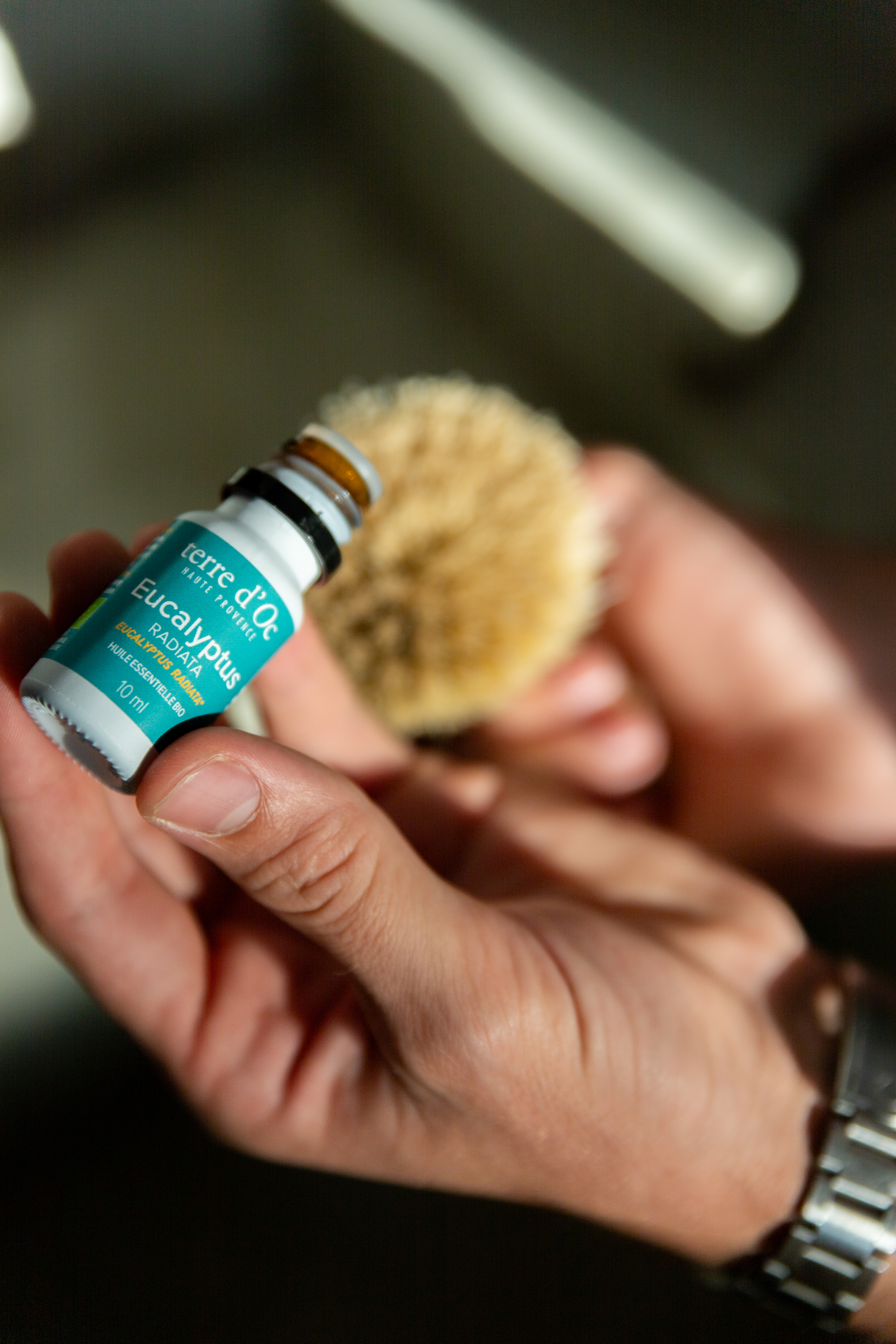 - Pour l’entretien de la maison : Liquide vaisselle : 100 ml de savon noir + 1 càc de bicarbonate de soude + 20 gouttes d’HE d’Eucalyptus radié – Odeurs de cuisine : 200 ml d’eau + 200 ml de vinaigre blanc. Faire chauffer avec un couvercle. Quand le mélange est à ébullition, enlevez le couvercle et ajoutez 10 gouttes d’HE d’Eucalyptus radié