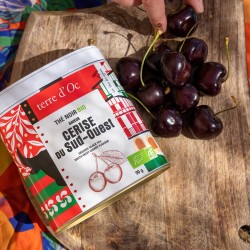 • Thé noir bio saveur Cerise du Sud-Ouest . 40 g - INGRÉDIENTS : thé noir* (Chine) 72%, cerises séchées enrobées* (Sud-Ouest) 10%, arôme naturel de cerise* 9%, hibiscus*.
